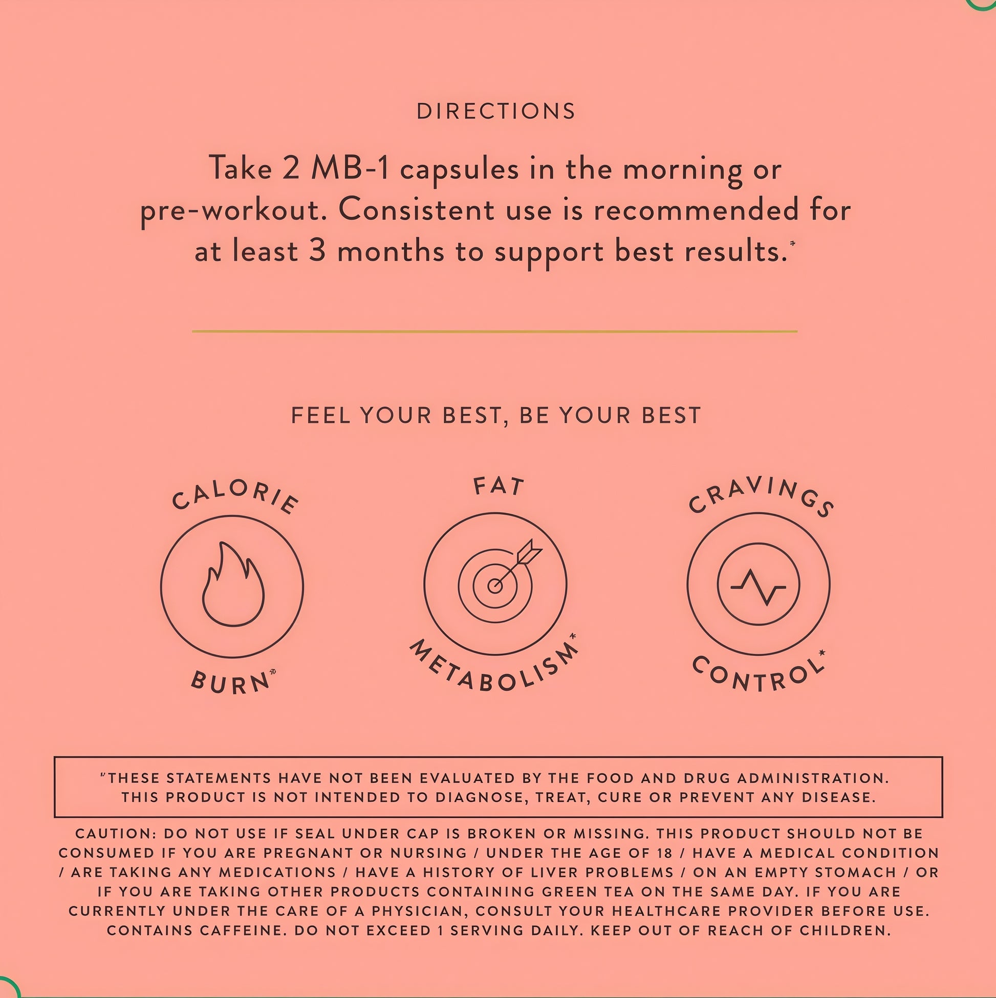 MB-1 is for anyone looking for a natural, effective solution for healthy weight management and optimizing metabolic health. We designed MB-1 to comprehensively target your metabolism, so whether you struggle with cravings, low energy levels, glucose spikes, body composition, or are simply looking to be preventative when it comes to your metabolic health, MB-1 can support you.